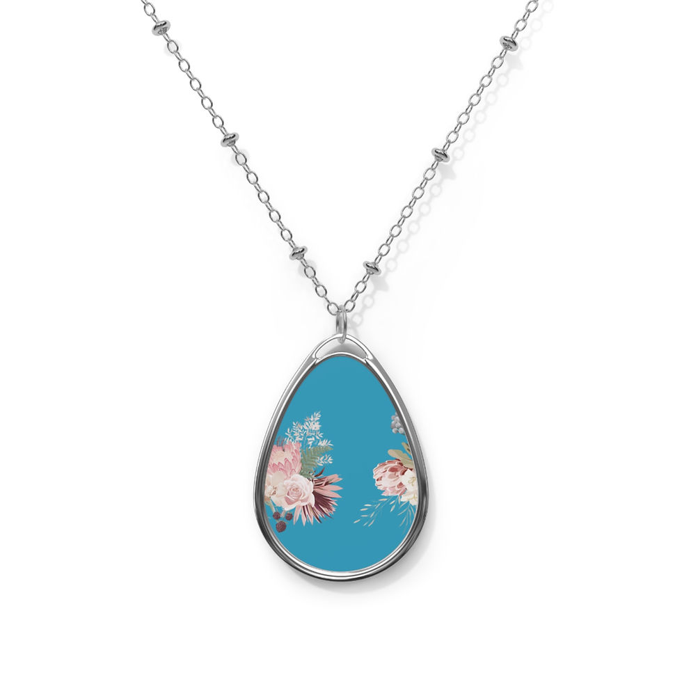 Floral Oval Pendant Necklace — Teal Flower Teardrop Locket